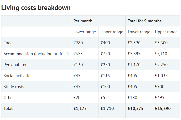 选择住宿舍的硕士生,一年生活费在£9,606.90 - £14,298.90之间;选择租房的硕士生,一年生活费在£9,816 - £11,076之间。