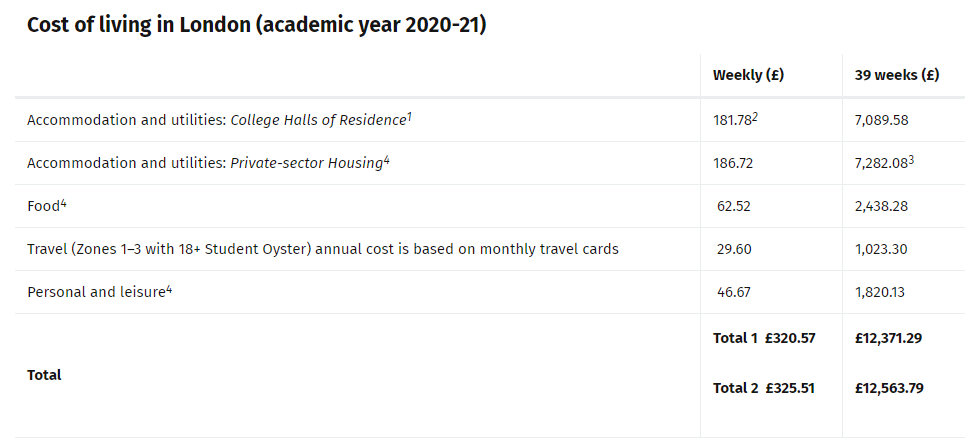 按照住宿52周(通常为硕士)统计的生活费为£16,571。