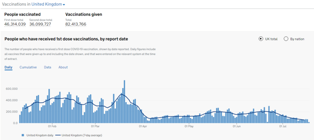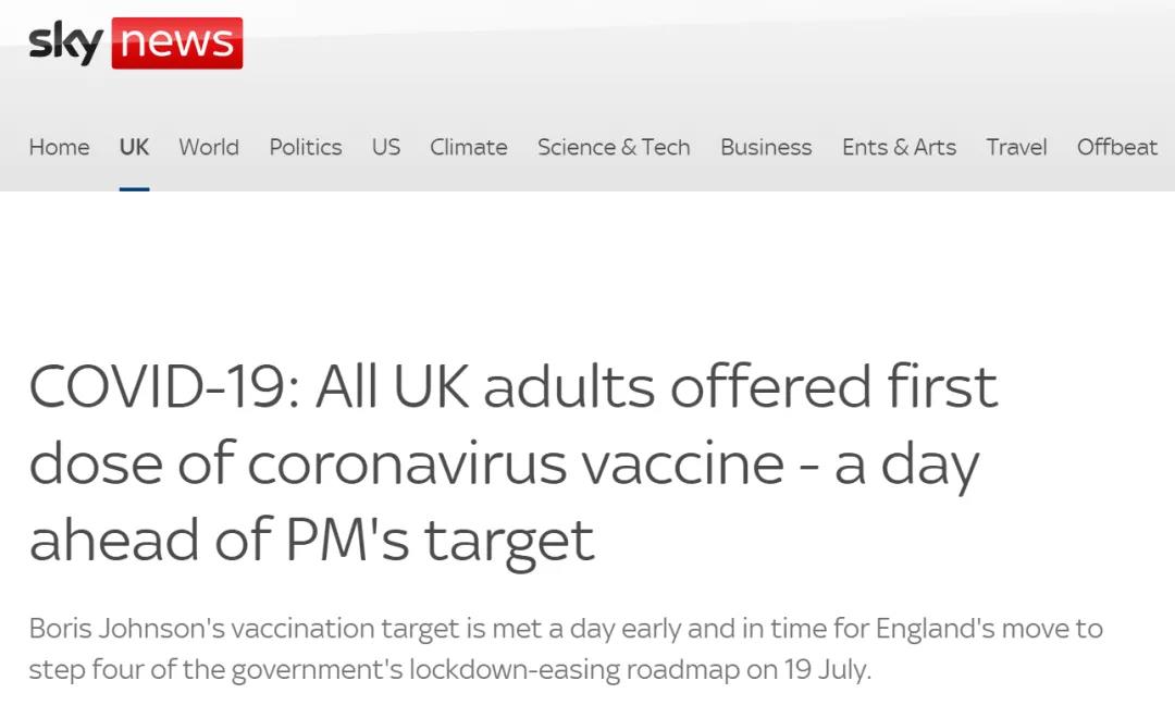 疫苗的成功推广:87%英国成年人已经接种第一针疫苗,66%已经接种第二针,离全民接种的目标越来越近。