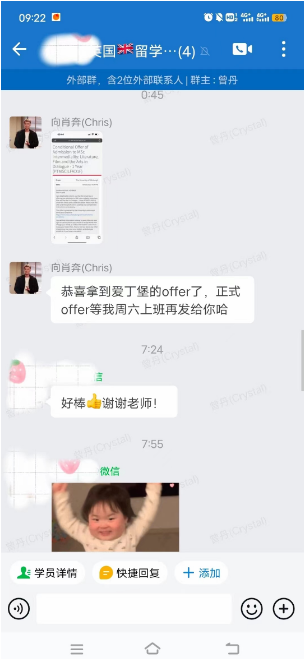 Y同学和妈妈是一个目标比较明确的人,国内已经是某985院校的研一学生,那么去国外的话当然院校是要有更高的一个层次追求。从见面到签约也就是几天的时间,对比了很多家机构,最后妈妈和孩子都觉得信任我,把这个事情交托给我来负责。
