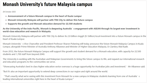狂砸28亿!莫纳什大学马来西亚再建新校区!坐落吉隆坡