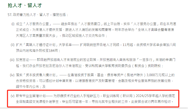 由于香港技术行业中端人才短缺,尤其在包括资讯科技、机电工程、建造、航空、海事、物流等行业,人才尤为紧缺,因此港府在2023年《施政报告》中提出了“职专毕业生留港计划”(VPAS)。