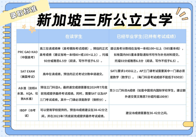 新加坡三所公立大学(新加坡国立大学、新加坡南洋理工大学、新加坡管理大学)根据申请成绩择优录取的同时,同时考核申请人背景经历例如:竞赛活动的含金量、慈善义工经历、科研经历、创新性的实践经历等作为附加考核条件。普遍接受高考成绩申请,但除了高考成绩之外还需要补充雅思或托福成绩。