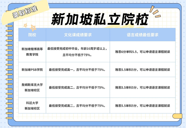 公立院校因政府提供学费资助,所以对学生入学要求比较严格。私立院校只要求学生提供高中阶段平时成绩,无需参加高考也可提前拿到录取通知书。并且部分学校允许学生高二毕业甚至最低要求初中毕业,无需提供雅思等语言成绩,可以先入读大学的语言预科课程。整体入学门槛适中,适合为绝大多数学生提供学习深造机会。新加坡私立院校一般来说分为中学、培训类学校、学位类学历教育院校和专门的职业学校。中国学生选择最多的是学位类学历教育院校(私立大学),完成三年(硕士为两年)专业课程后可获得由英、美、澳等国合作大学颁发的学士、硕士学位,学生还可赴合作大学攻读最后一年课程。