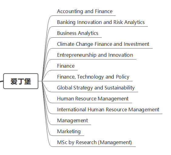爱丁堡商学院有很多课程,除了传统的会计与金融、金融、管理和会计等通常意义上的专业,还设置有气候变化金融和投资这样随着新能源发展出现的专业,商学院也有相关的研究组织和课题专门研究相关情况。爱丁堡大学商学院课程设置如下:
