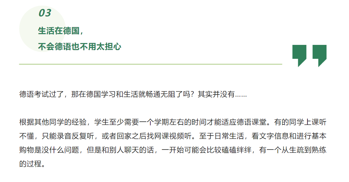 除了德福之外,学生还可以选择歌德、Telc或DSH等考试,这些考试各有特点。可以在了解考试特点之后选择适合自己的考试。来德国读语言班也是可以的,能有一个更好的德语氛围,也能提前适应在德国的生活。