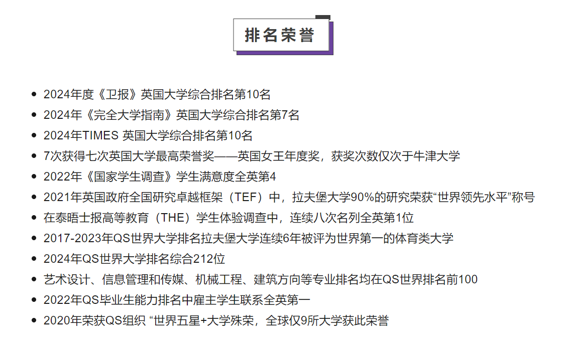 在英国三大本土排名中,拉夫堡大学也有非常亮眼的成绩,均位列英国前十。2024年度《卫报》英国大学综合排名第10名,2024年《完全大学指南》英国大学综合排名第7名,2024年TIMES 英国大学综合排名第10名。