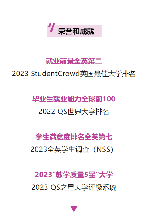 作为全英175所高等教育机构中仅有的15%获得三金奖项的高等教育机构之一,也是英国东米德兰兹地区唯一获此荣誉的大学。拉夫堡大学和牛津大学 、剑桥大学、华威大学、巴斯大学等同获三金奖项的高水平大学一样,致力于为学生提供卓越的教学,帮助大家进行有效的学习并取得杰出的成绩: