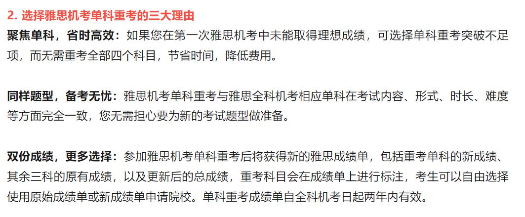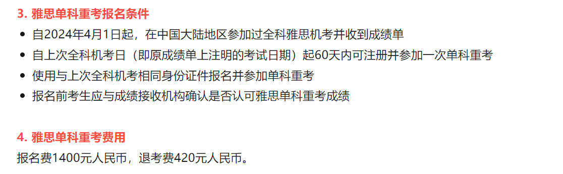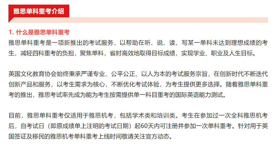 3月21日,英国文化教育协会宣布,针对雅思单科未达理想成绩的考生开放单科重考。雅思单科重考将率先在北京、上海、广州、重庆的英国文化教育协会办公室考点进行。首场考试时间为5月6日,报名系统已于4月26日对外开放。需要注意的是,雅思单科重考目前仅适用于雅思机考。考生在参加过一次全科雅思机考后,自考试日(即原成绩单上注明的考试日期)起60天内可注册并参加一次单科重考。