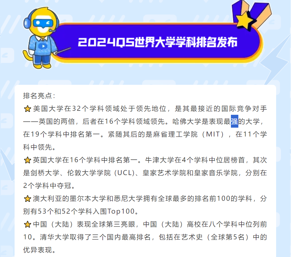 留学资讯2024QS世界大学学科排名发布!2024/04/28/周日 17:55点击量:198 更多文章留学资讯最后两个月!高考生申请香港八大院校本科保姆级资讯~过不久就要迎来今年的高考了,很多家长和考生在参加高考的同时,也会关注留学。香港本科求学也非常的受欢迎,现在香港院校的本科申请正在开放中,在考... 查看详情>> 发布日期:2024-04-28 阅读量:209查看详情 在线咨询 留学资讯2024QS世界大学学科排名发布! 查看详情>> 发布日期:2024-04-28 阅读量:198查看详情 在线咨询