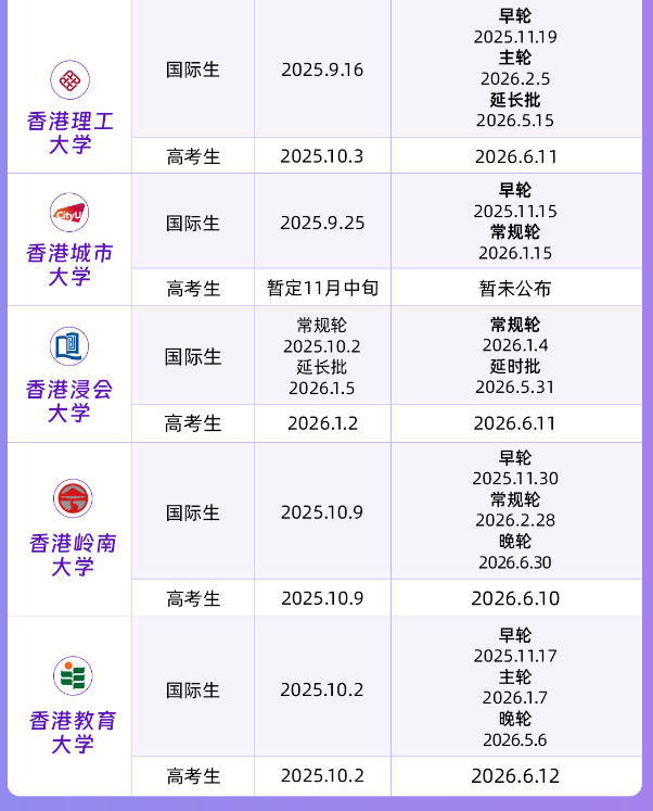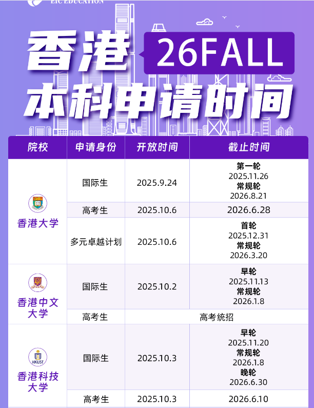 梦想在香港开启大学生涯的同学们注意了!26Fall(2026年秋季入学)的本科申请战役已经打响。与内地高考统招不同,港校普遍采用自主招生,申请时间线拉得很长,“早规划、早准备、早申请” 是斩获Offer的不二法门。为了让大家不错过关键节点,我们特意整理了这份【香港院校26Fall本科申请时间汇总图】,速来查收!