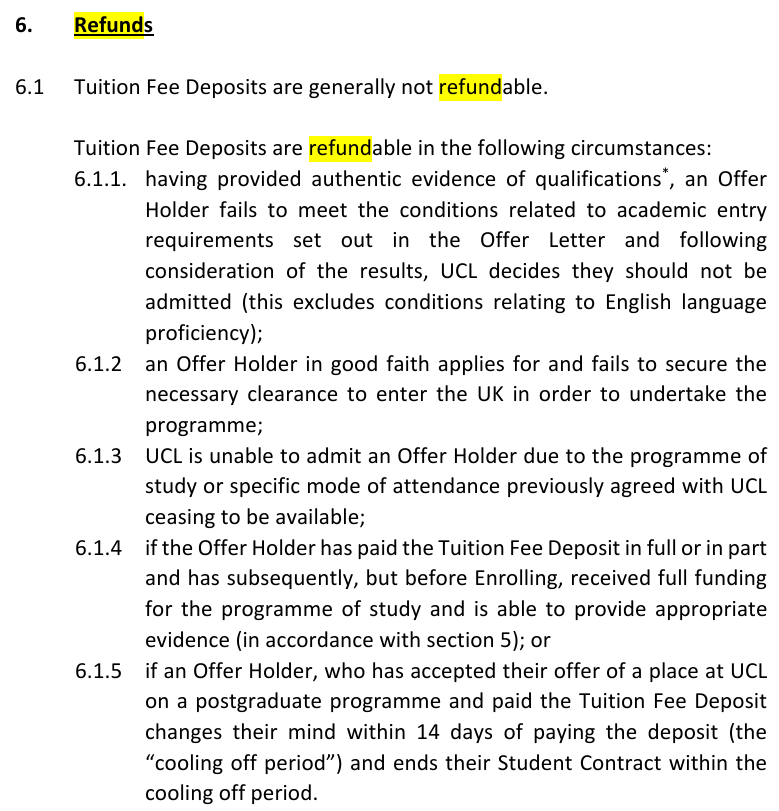 6.1.5 录取持有人已接受 UCL 研究生项目录取并缴纳学费押金,且在缴纳押金后 14 天内(即 “冷静期”)改变决定,并在该冷静期内终止学生合同。