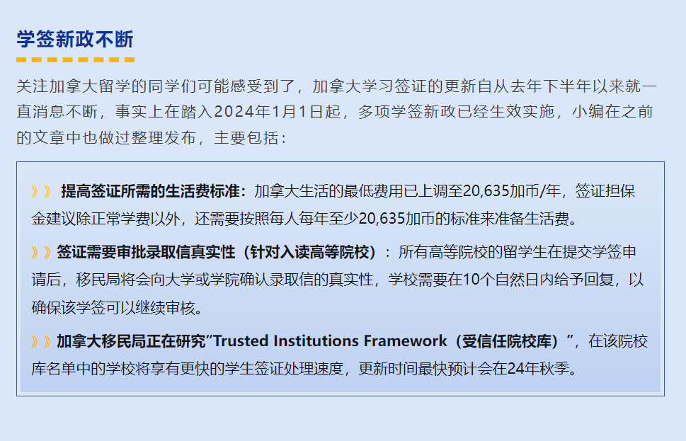 加拿大作为传统热门留学国家,一直备受中国学生欢迎!不输欧美的文凭含金量、极具性价比的留学花销、丰富多元的文化氛围,都促进了留加国际学生数量的持续增长。此次新政更新,相信所有关注加拿大留学的同学与家长都有着很多疑惑,新政到底对留学生有什么影响?未来想留学加拿大是否难度增加?今天Hannah学姐就带大家一起梳理下本次新政内容,希望可以对大家有所帮助。