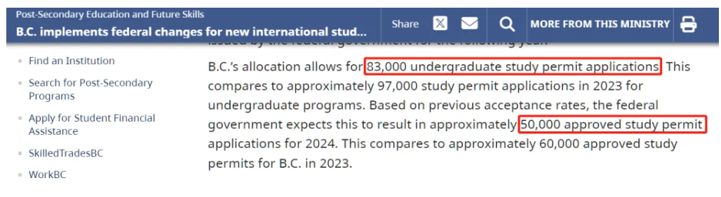配额省内分配情况:省内公立高等院校将获得 53%的省级证明信,而私立教育机构得到其余 47%。BC省政府在通知中提到,这个分配比例是为维护公立高等院校的国际生项目可以顺利运营,同时管理今年和未来数年的国际招生增长。需要注意的是,上述数据只代表证明信配额分配,并不代表获批的学习许可。