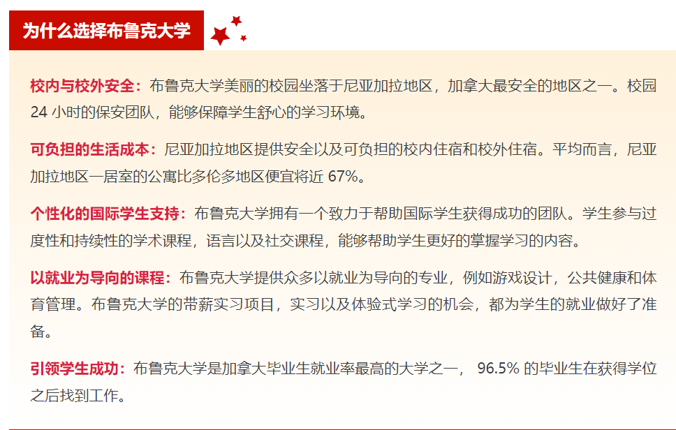 虽然加拿大的硕士申请一直以“高标准,严要求”著称,但其世界认可的高含金量学历、北美优质的教育质量、毕业后相对宽松的移民政策,使得大家对硕士申请的热度只增不减。很多家长和同学对于加拿大大学的印象可能只局限于闻名世界的多伦多大学、滑铁卢大学、韦仕敦大学等,但其实,在加拿大本土企业和本地人眼中,还有更多的“王牌”大学都是非常亮眼的存在,比如布鲁克大学 (Brock University),这所建校于1964年老牌高校,是加拿大著名的公立综合性大学之一,位于加拿大安大略省圣凯瑟琳市中心,距离多伦多车程大约1小时,距离美国纽约州水牛城大约30分钟,距尼亚加拉大瀑布仅15分钟。布鲁克大学开设100+本硕专业,众多王牌专业都含有带薪实习和拥有超高就业率。大学的Goodman商学院是 AACSB 全球认证商学院,被评为加拿大顶尖商学院之一,也是目前安大略省唯一提供 MBA 和 CPA 组合课程的商学院!商学院的带薪实习项目更是为毕业生带来了超强的竞争力;大学设立安省教育协会认证的教育学双学位,毕业生优势更大;同时也是加拿大唯一提供酒相关专业的大学。布鲁克大学还是加拿大学生满意度最高的大学之一。