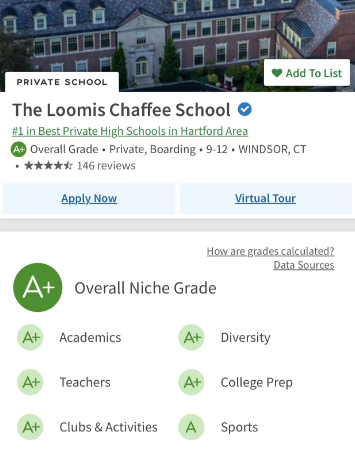 LCS 是美东小常青藤联盟成员,全美寄宿高中中排名第 7 位,Niche 常年评价 A+: