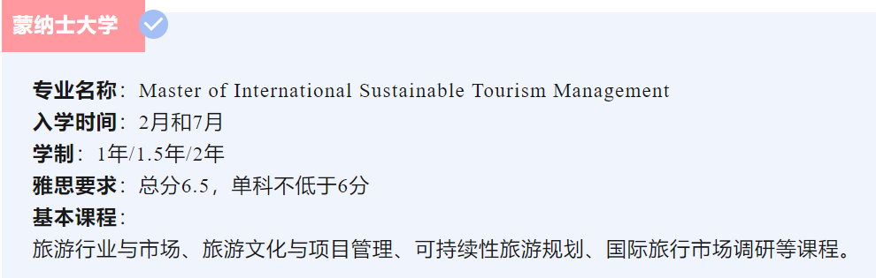 蒙纳士大学的Master of International Sustainable Tourism Management专业,给未来想要从事旅游行业的学生提供了很好的学习机会。