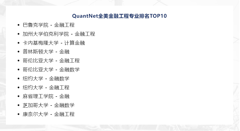 美国研究生阶段,统计学一般分为理论统计和应用统计两个方向。新冠疫情让公共卫生专业“火上加火”,而公卫专业细分方向中,生物统计受到了很多人的欢迎,一些美国大学也将生物统计设置为单独的专业。如果想申请生物统计硕士,最好在具备优秀的数学成绩的情况下,拥有1-2门跟生物学或公共卫生相关的专业来提升自己的专业背景。金融工程/金融数学
