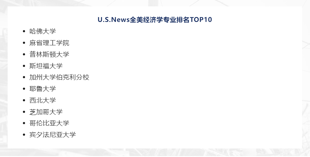 金融学对申请人数理背景的要求不像金融数学那么高,但美国金融领域注重量化分析的特点也肯定了数学在金融专业中的重要作用。常规的先修课要求里有线性代数、微积分、概率论与数理统计等数学基础课程。 经济学研究生阶段的经济学需要更多地依靠统计模型和软件来完成相关研究样本和数据处理,比如计量经济学,就是更多地以统计和概率论为基础延伸的。美国的经济学专业更看重学生通过建模来分析解决经济现象问题的能力,数理背景强的同学就有优势啦。另外,相对于金融工程,经济学的竞争相对低一些。所以,也是一个不错的选择。商业分析
