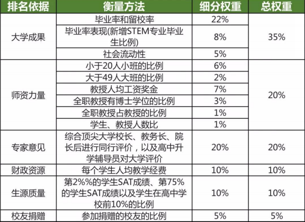 USNews 的排名通过对美国大学基于6项主要指标加权平均计算所得。 这些指标主要包括:大学成果、师资力量、专家意见、财政资源、生源质量、校 友捐赠等七大部分。各个部分又有 2-3 个具体指标。