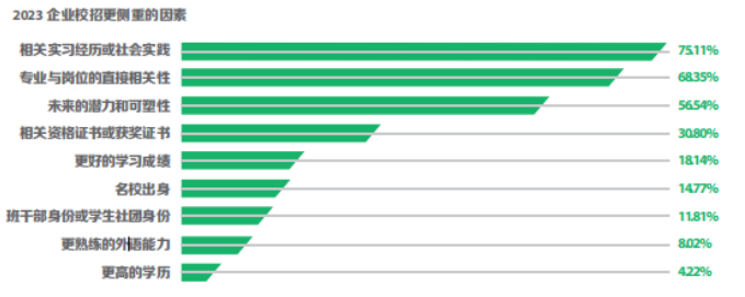 超过 75% 的企业表示,他们在选拔应届生时更注重相关实习经验或社会实践。