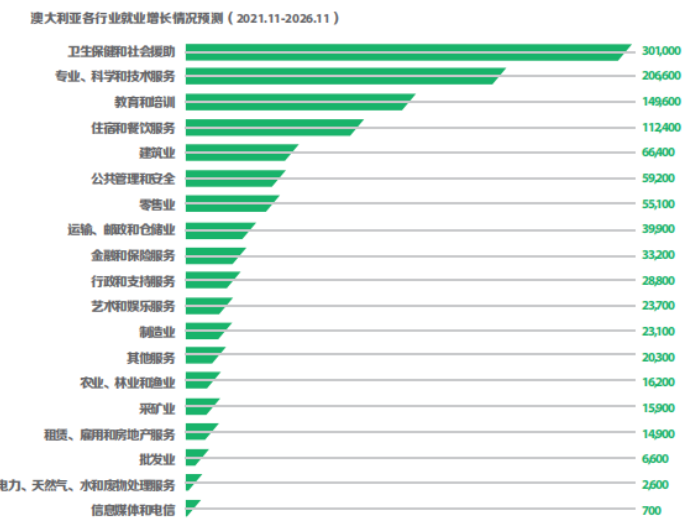 预计增长最大的五个行业具体是:卫生保健和社会援助,专业、科学和技术服务,教育和培训,住宿和餐饮服务,以及建筑业。