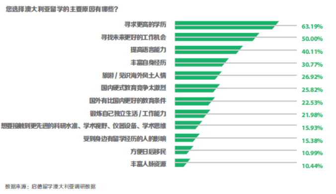 选择澳大利亚留学的学生最主要的几个原因依次为:“寻求更高学历”(占比 63.19%)、“寻找更好的未来工作机会”(占比 50%)、“提高语言能力”(占比 40.11%)以及“丰富个人经历”(占比 30.77%)。