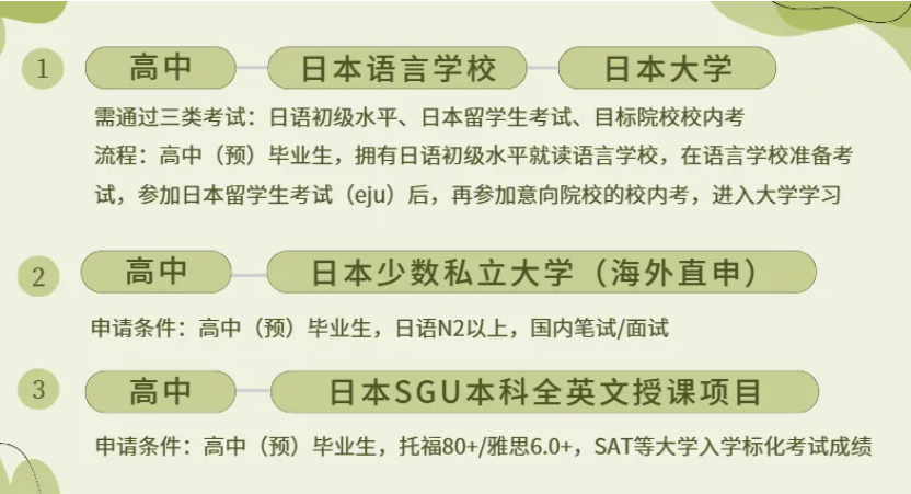 1赴日读本科途径与国内本科一样,日本大学学部也以4年学制为主。主要通过如下三种路径,升读日本大学本科课程: