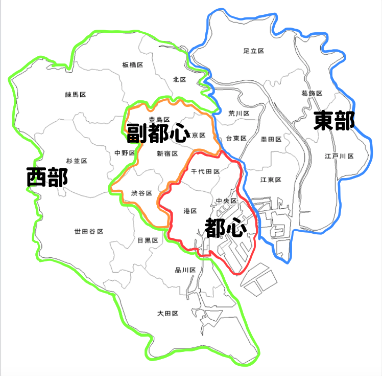第二种分法是将东京中心地区即主要商业区域称为都心3区、副都心4区,其余地区分成东西部(也可以细分为东西南北)。