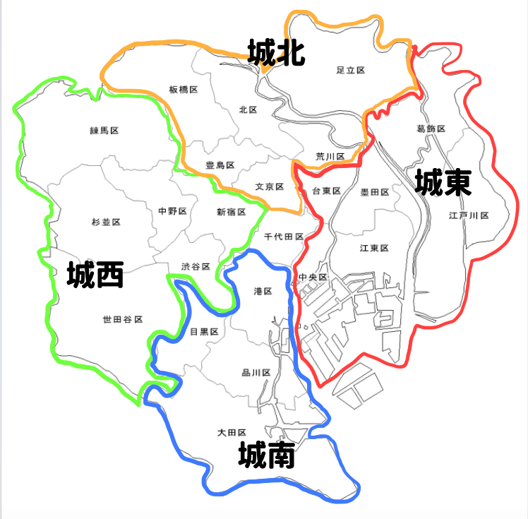 「东京23区」大致有两种划分法,一种是以皇居所在地千代田区为中心,分成东西南北。