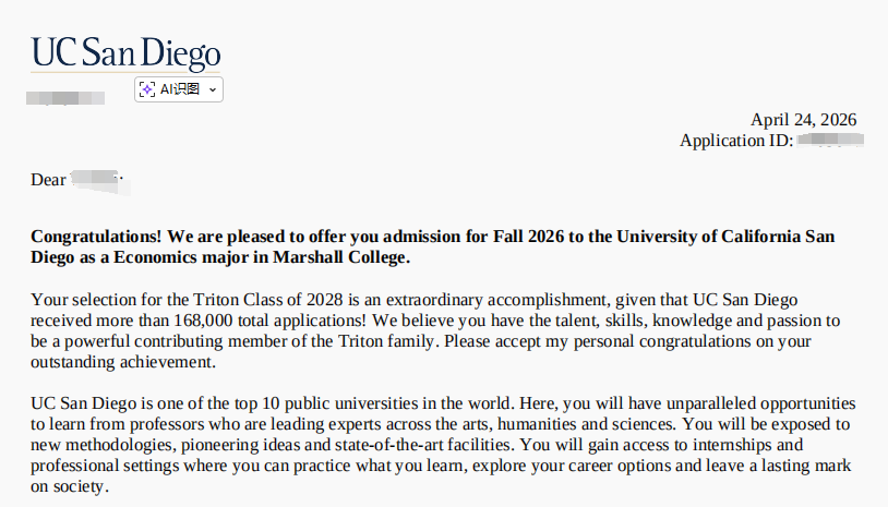 成功转学至UC系统大学,斩获全球排名21的加州圣地亚哥大学录取。