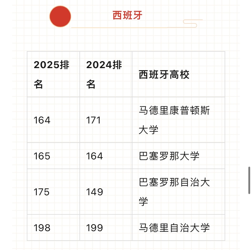在2025QS中,西班牙有4所大学进入前200名,共有15所进入榜单500强。
