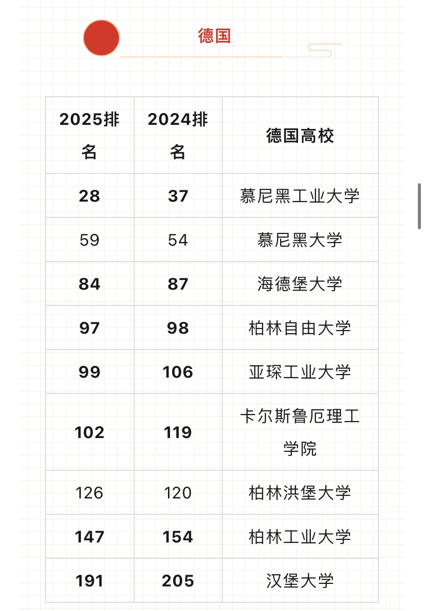 在2025QS中,德国有9所大学进入前200名,慕尼黑工业大学位居排行榜全德第一,位居全球28位。其中,200强中,慕尼黑工业大学、海德堡大学、柏林自由大学、亚琛工业大学、卡尔斯鲁厄理工学院、柏林工业大学、汉堡大学,这7所德国高校排名均较去年上升,集体升咖。一共有28所德国高校进入榜单500强。