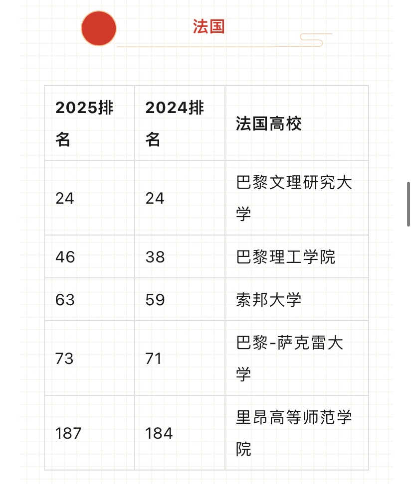 法国巴黎文理研究大学位列第24名,法国巴黎理工学院位列第46名,索邦大学位列63名,巴黎萨克雷大学位列第73名。