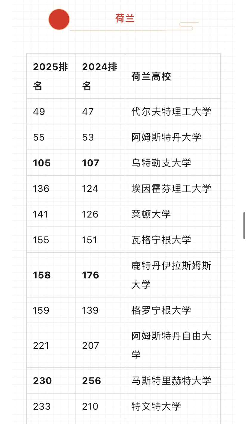 在2025QS中,荷兰有8所大学进入前200名,依然是2所大学进入前60。荷兰13所U类大学均位居排行榜前350位。