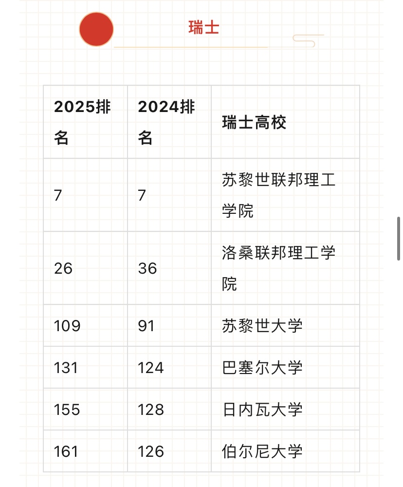 欧洲板块排名中,瑞士苏黎世联邦理工学院位列TOP7,依旧位列世界前十名;洛桑联邦理工学院位列第26名,相比24年排名上升了10名。