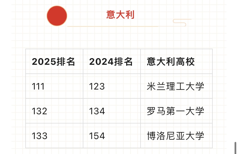 意大利一共42所大学上榜,仅次于德国的48所,居世界第九名。意大利有三所大学进入前150,分别是:米兰理工大学111,罗马大学132,博洛尼亚大学位133,这三所大学排名比2024年都有提升。