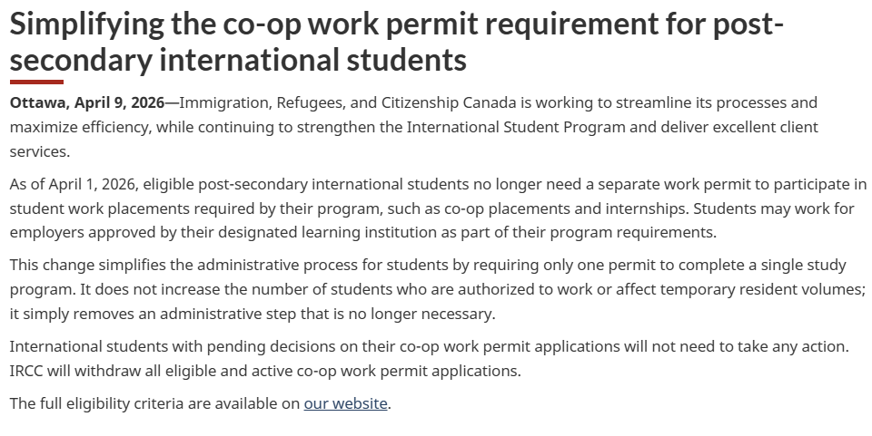 2026年4月9日,加拿大移民、难民和公民部(IRCC)发布了一项旨在简化行政流程、提升效率的重要政策。该新政直接关乎众多在加拿大就读并需要参加Co-op(带薪实习)或相关实习项目的国际学生。以下是针对此次新政的详细解读及其对国际学生的具体影响。