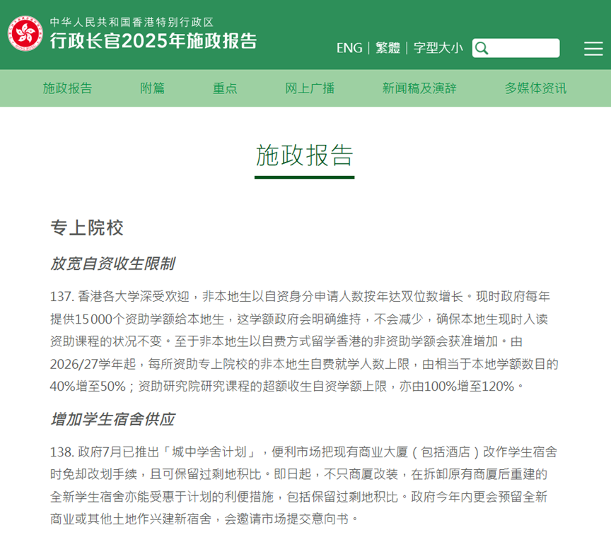 香港2025施政报告出炉!港八大非本地生学额扩招至50%,住宿增加!