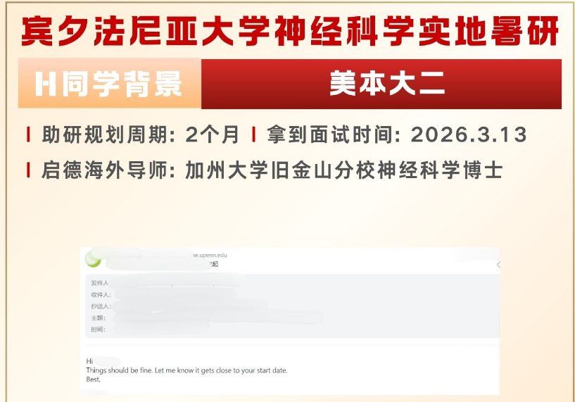 美本大二H同学收获宾夕法尼亚大学神经科学方向实地暑研offer!