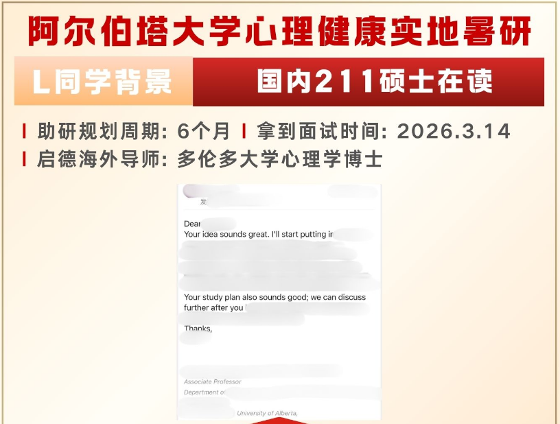 国内211硕士在读L同学收获阿尔伯塔大学心理健康方向实地暑研offer!