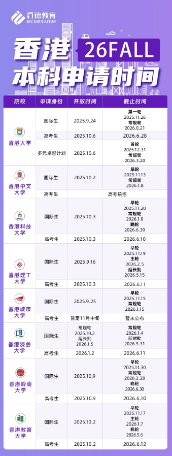 香港高校26fall本科申请Deadline全汇总!梦想在香港开启大学生涯的同学们注意了!26Fall(2026年秋季入学)的本科申请战役已经打响。与内地高考统招不同,港校普遍采用自主招生,申请时间线 查看详情>>