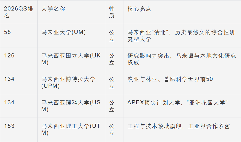 01 2026QS前500!马来西亚优质大学清单 无论是追求学术声誉的公立名校,还是看重名校资源的海外分校,马来西亚都有亮眼选项,以下是2026年QS世界排名前500的核心院校:
