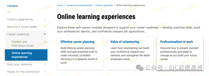 online线上服务很多同学最先会用到的就是线上的模块:官网把这部分做成了一整套的职业支持体系,里面包括了行业经验,领导能力,职业必备技能,拓展人脉机会等具体模块。面试小白们这里敲黑板啦!首先对于最基础的部分,也就是简历,cover letter,Linkedin,和面试准备这些,学校都给出了具体的指导。对于很多在澳洲求职的同学,最难的不是不努力,而是不熟悉澳洲的简历应该怎么写,cover letter写到什么程度,Linkedin是不是一定要弄。这时候学校给出的指导资源就很实用,至少能够让你把“求职基础装备”补齐,在投简历的时候不会输在格式和表达上!