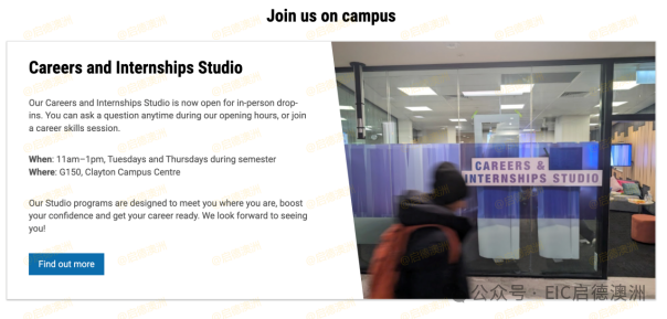 另外 Careers and Internships Studio 也可以 in-person drop-in,学期中开放时间是:周二和周四 11am–1pm,地点在 G150, Clayton Campus Centre。这就意味着你不用只是对着网页发呆,也可以带着具体问题去现场问。