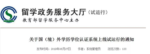 近日教育部留学服务中心发布《关于国(境)外学历学位认证系统上线试运行的通知》,将对国(境)外学历学位认证系统进行升级改造,新版认证系统于2019年6月28日上线试运行,申请人从28日上午10时开始,可进入新版系统在线办理认证申请。