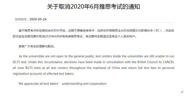 雅思考试6月宣布取消