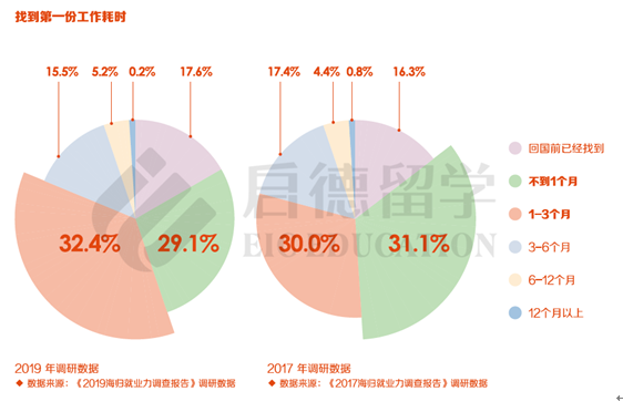 整体来看,绝大多数的海归积极主动的投入到求职大军当中,回国找到第一份工作的耗时大多都在合理范围内,并且选择逃避就业压力的海归占比也有所下降。据《2019 海归就业力调查报告》调研数据显示,在已经找到工作的受调研海归中,79.1%的海归在3 个月内找到了第一份工作,比2017 调研数据增加了1.7%。其中,17.6% 在回国前已经找到,29.1% 不到1 个月找到,32.4%