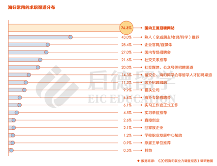 《2019 海归就业力调查报告》调研数据显示,海归找工作最常用的5 个求职渠道分别是:国内主流招聘网站(76.3%)、熟人(亲戚朋友/ 老师/ 同学)推荐(43.0%)、企业官网/ 自媒体(28.4%)、国内专场招聘会(27%)、社交关系推荐(21.6%),国内主流招聘网站占有绝对优势,是海归求职最主要的渠道。对于2017 年调研数据,企业官网/ 自媒体求职渠道使用人数占比已经超过国内专场招聘会,排位已从第4位升至前3名。
