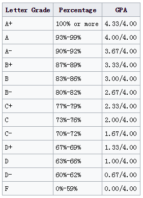 上面是一种较为常见的 Grading Scale,但是相对而言较为严格,按照这种方式计算出来的 GPA 会比较低。